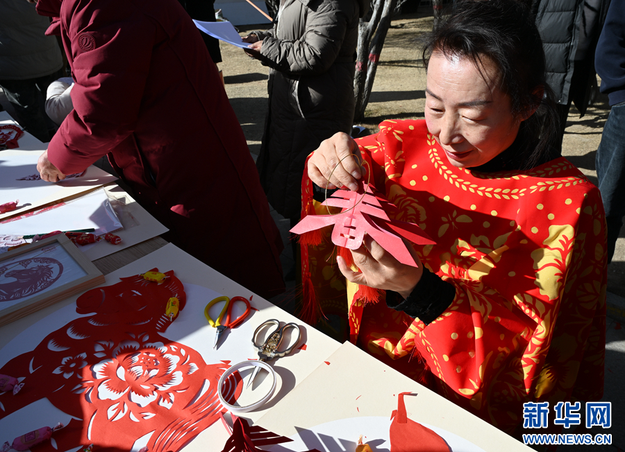 1月14日,青海西宁,剪纸爱好者在活动现场制作手工艺品。